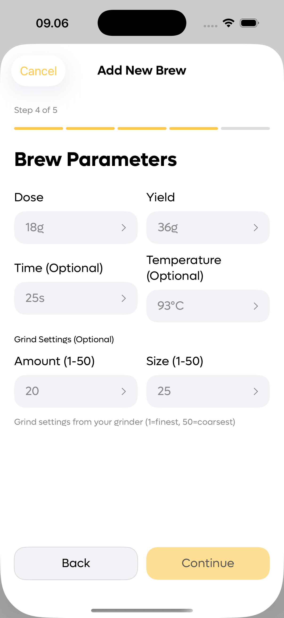Log your daily brews with dose, yield, grind size, and temperature. Never forget what worked.
