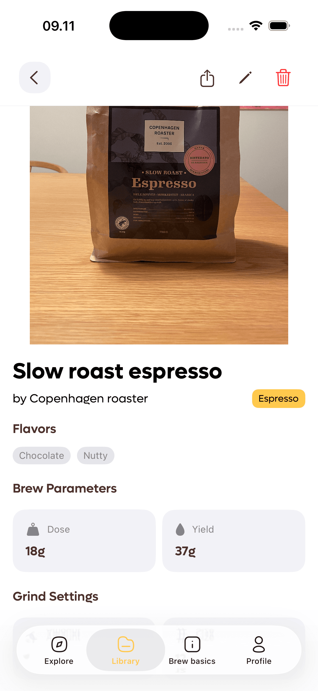Save your favorite coffee beans with roast dates, origin, tasting notes, and perfect grind settings for each one.